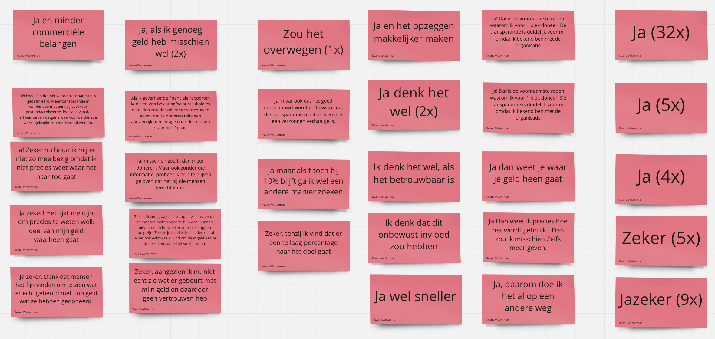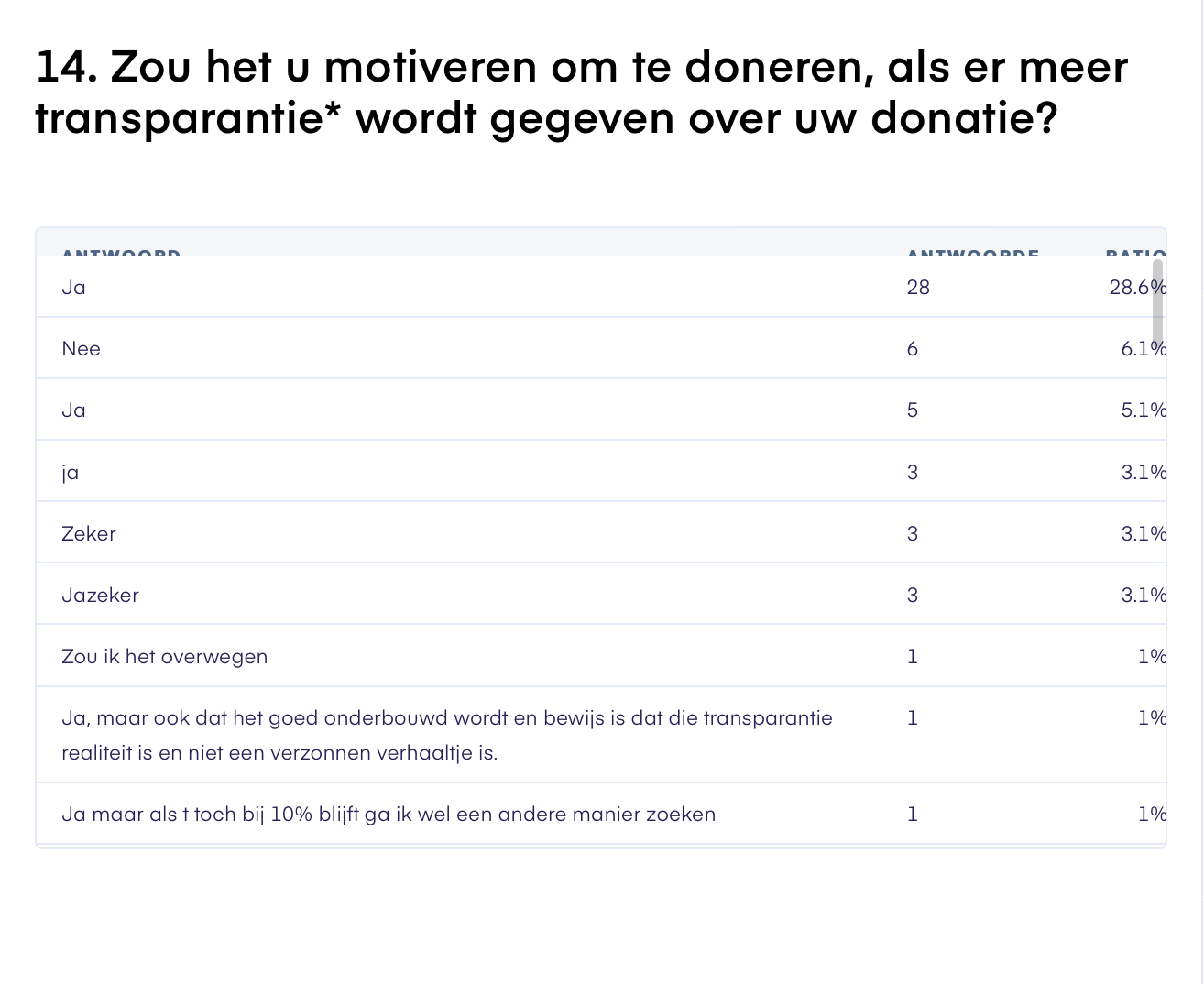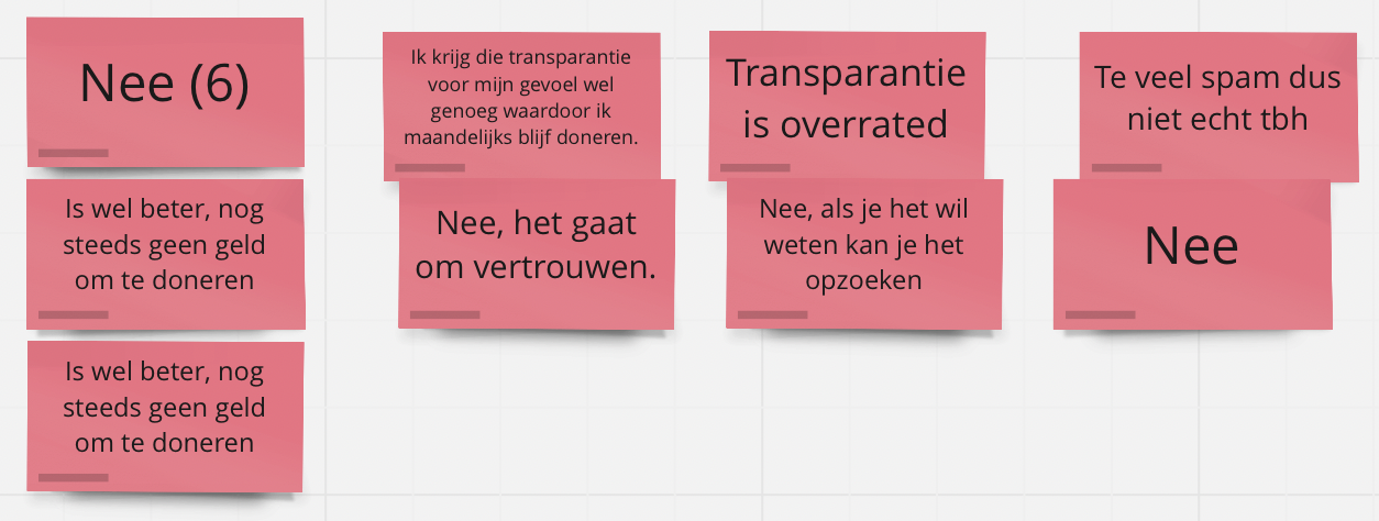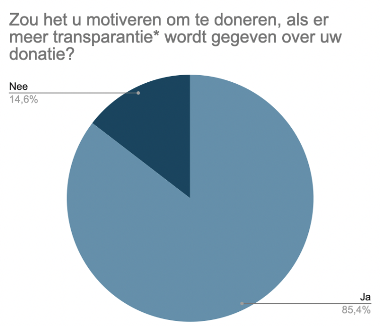 Volgende respondenten is 85% van de 96 respondenten van mening dat zij meer gemotiveerd worden om te doneren als er meer transparantie is over hun donatie. Sommige respondenten gaven wel aan dat de inzichten van deze transparantie zo moeten zijn dat het bedrag niet voor maar een gedeelte van 10% naar het daadwerkelijke doel gaat. Dus de transparantie moet wel positief zijn.&#x20;