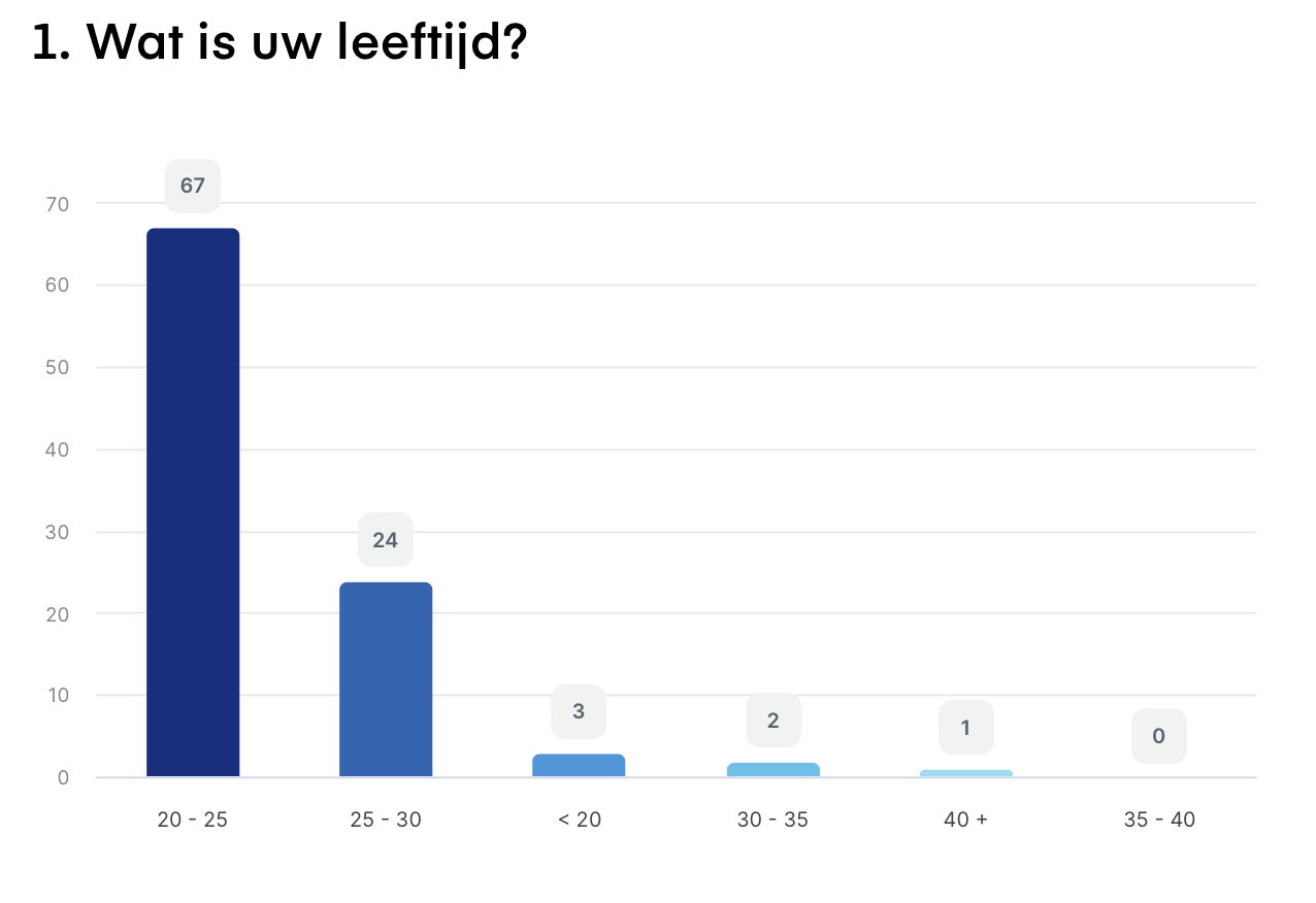 <figure><img src="https://1878294948-files.gitbook.io/~/files/v0/b/gitbook-x-prod.appspot.com/o/spaces%2FGVdys9K9uQuy1wuHtCfN%2Fuploads%2FTRpQFFpLt9HNdlpjvONr%2FSchermafbeelding%202022-11-02%20om%2019.11.41.png?alt=media&#x26;token=554bd8e4-74ba-4a19-964e-00129630a632" alt=""><figcaption><p>Een staafdiagram uit de eerste vraag van de enquete. Deze diagram laat zien wat de leeftijd is van de participanten</p></figcaption></figure>